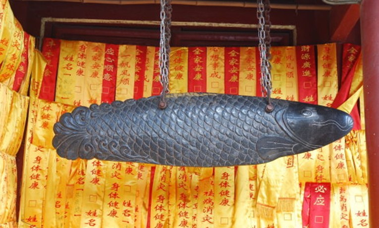 石魚:潭柘寺觀音殿西側(cè)有龍王殿,殿前廊上有一石魚,長1.7米、重150公斤,看似銅,實(shí)為石,擊之可發(fā)五音,傳說是南海龍宮之寶,龍王送給玉帝。后來人間大旱,玉帝送給潭柘寺消災(zāi)。一夜大風(fēng)雨時,石魚從天而降,掉在院中。據(jù)說石魚身上13個部位代表13個省,哪省有旱情,敲擊該省部位便可降雨。現(xiàn)在寺中的石魚為后來復(fù)制的。