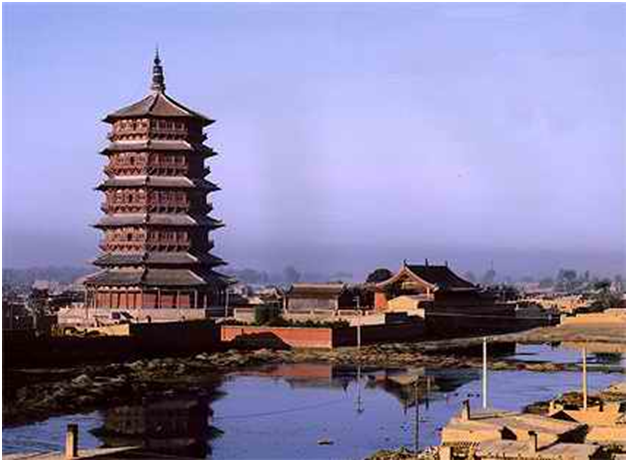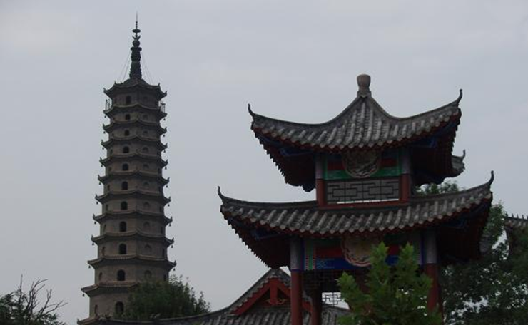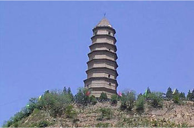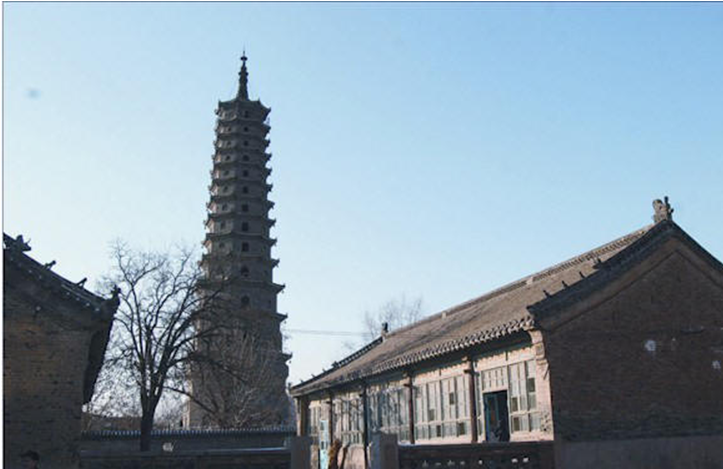 史稱唐塔,原名大覺寺塔,始建于唐貞觀十三年(公元639年),碑記為“尉遲敬德監(jiān)建”,距今已1300多年。原塔為八角密檐式磚石結(jié)構(gòu),青磚到頂,飛檐挑角,角系銅鈴,塔身13級,第一級南北各一門,其上每一級一南門,頂有相輪,全塔高約36米。明代維修時(shí),吏部尚書楊巍撰有《重修大覺寺寶塔》,并刻石豎碑。