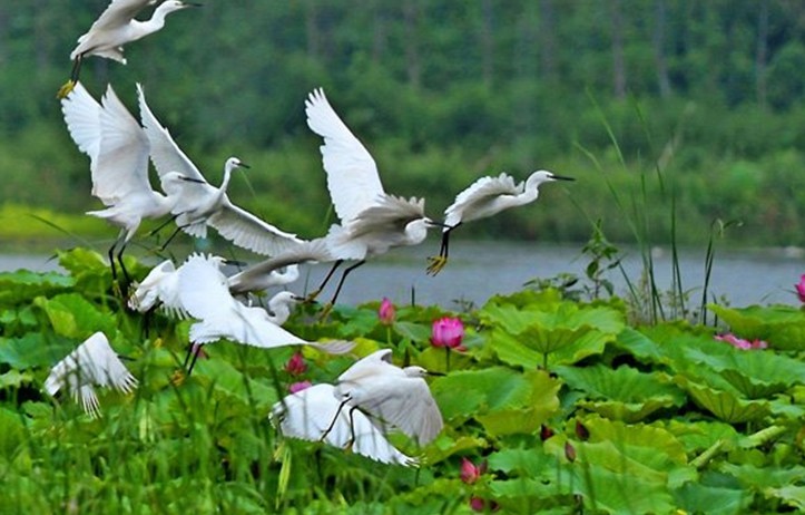 濕地植被以禾本科、菊科、莎章科、豆科、寥科和眼子菜科為主的植物構(gòu)成。主要植物群落有蘆葦群落、茄群落、蓮群落等挺水植被帶;杏菜群落、菱角+芡實群落等浮葉根深植被帶;馬來眼干菜、微齒眼子菜群落、苦草植物群落等沉水植被帶,水生植被蓋度達89.9%,有“水下森林”的美譽。受國家一、二、三級保護的植物主要有水蕨、粗梗水蕨、中華秸縷草和野大豆等9種。