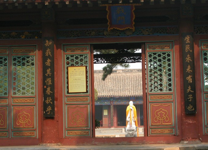 據《孟子》記載:“孟子曰:‘伯夷,圣之清者也;伊尹,圣之任者也;柳下惠,圣之和者也;孔子,圣之時者也。’”意思是說,在圣人之中孔子是最適合時代的。據此,清世宗于雍正八年(1730年)欽定孔廟正門名“圣時門”。圣時門始建于明永樂十三年(1415年),3間,弘治年間擴為5間中設拱門3券,碧瓦歇山頂,四周是深紅的墻皮,券內是杏黃的墻里,前后石階上各有石刻龍陛。由拱門內望,令人有深邃莫測之感。