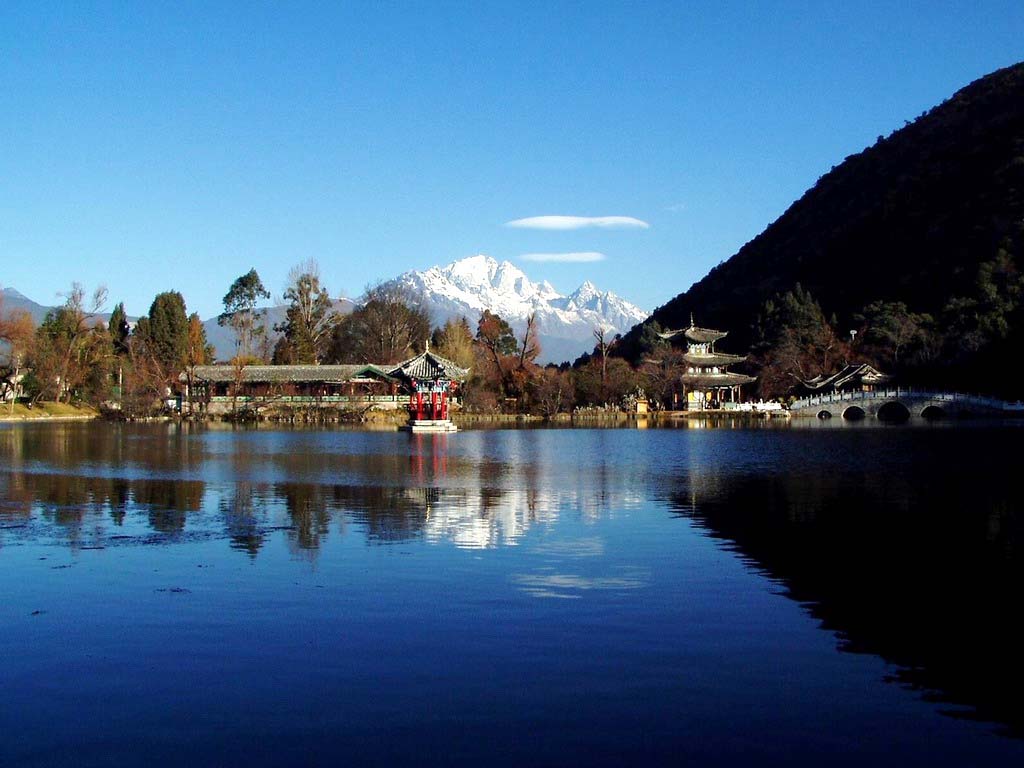 黑龍潭公園位于昆明北郊的龍泉山五老峰下,(亦稱龍泉山麓,太極山、五老山), 昆明黑龍潭占地面積91.4公頃,距離市區約17公里。這里古木參天,泉壑幽邃,修竹茂林,潭深水碧,景色幽深。民間傳說有黑龍王潛藏于此,故稱黑龍潭亦稱龍泉山麓,距離市區約17公里。黑龍潭內有罕見的大型梅園,是昆明的賞梅勝地,稱為“龍泉探梅”。園內的“唐梅”相傳由南詔移植過來,同安寧漕溪寺的“元梅”被認為是云南最珍貴的古梅。在黑龍潭內還有這樣的奇怪現象,潭以中間的石橋為界一分為二,一清一濁,清濁之水互不相融,據說連魚兒都互不過界,頗為神奇。黑龍潭是有名的道教勝地,分為上下兩觀,從漢代的黑水祠演變而來。上觀始建于唐宋時期,始稱龍泉觀,下觀始建于明代,俗稱黑水宮。1997年,黑龍潭游覽區占地3.6公頃。1999年,黑龍潭有風景林51.4公頃,植有各種喬灌木12萬多株。梅園28.5公頃,地栽梅5794株,盆栽梅1725盆。庭園占地6.9公頃,有喬木3973株,灌木48660株,修竹306叢。 1978年建苗圃,占地5.6公頃。建有杜鵑谷,植各種杜鵑10萬多株。1998年又新辟一期綠化工程,占地33公頃,游覽區擴大到45.4公頃。園內有昆明市綠化委員會掛牌保護的古樹名木18株,是昆明市存有古樹名木最多的風景名勝區。麗江黑龍潭始建于乾隆二年(1737),其后乾隆六十年、光緒十八年均有重修記載。舊名玉泉龍王廟,因獲清嘉慶、光緒兩朝皇帝敕封“龍神”而得名,后改稱黑龍潭。詩云:“泉渙渙兮漣漪,問何時最是可人?須領略月到天心,風來水面;亭標標而矗立,看這般無窮深致,應記取云飛畫棟,雨卷珠簾。”黑龍潭以其天生麗質,名列《中國名泉》、《中國風景名勝》等書,誠不虛也。迎面見有一座涂金繪彩的牌樓,門口四尊石獅,肌理秀美,威武雄壯,過去守護木氏土司衙門,1966年遷此守護玉泉。進門往右,但見垂柳飄指,一潭澄碧,樹底天光云影,樹梢樓臺隱現。沿潭右堤至鎖翠橋,橋上古人有聯云:“驚濤撼樹飛晴雪,未雨垂虹臥曲波。”它生動地描繪了橋邊景致。右邊橋下三孔飛瀑,水花四濺,上觀景區濤聲如雷,流向古城,玉水河畔,楊柳依依,濃蔭蔽日。往橋的左邊看,一座五孔石拱橋,長虹臥波一般,將潭一分為二,玲瓏俊美的一文亭、得月樓分別屹立內外潭心,四面臨水,有橋與岸上相連。此樓始建于清光緒二年(1876年),樓名取自古人對聯“近水樓臺先得月、向陽花木早逢春”中三字。1963年重建時,郭沫若為該樓題寫了匾額“得月樓”三字及兩[1]副對聯。一副是集毛澤東詩詞句:春風楊柳萬千條,風景這邊獨好;飛起玉龍三百萬,江山如此多嬌。另一副是郭老撰書的楹聯:龍潭倒映十三峰,潛龍在天,飛龍在地;玉水縱橫半里許,墨玉為體,蒼玉為神。全聯僅三十字,卻寫出了麗江黑龍潭的神韻,書法遒勁而灑脫奔放,為公園增色不少。遠處玉龍雪山倒遇潭中,可見“雪山四萬八千丈,銀屏一角深插底”奇景。象山半壁也映入水中,使黑龍潭山中有水,水中有山,山水相映,景色無比秀麗。
