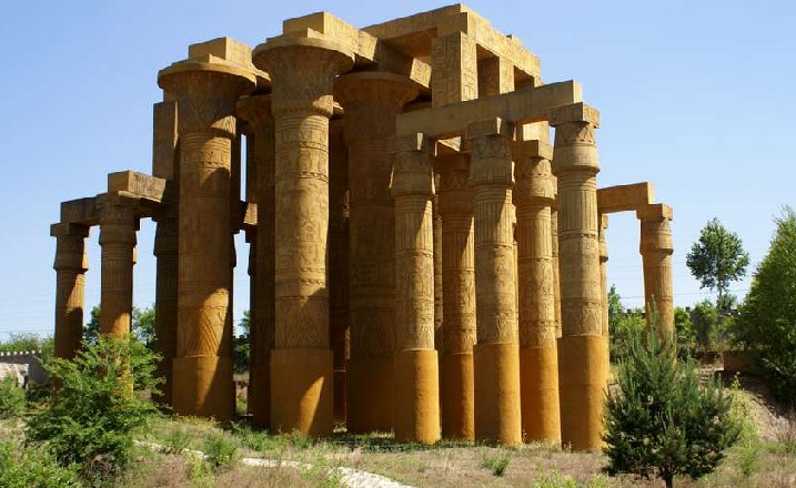 卡納克神廟是埃及的雄偉高大的建筑群。公元前1870年,埃及法老下令修建了一片廟宇群,它由20多座神廟組成。它是法老敬獻給太陽神和月亮神的最高禮物,經過三千多年的風雨侵蝕,現已殘缺不全。這些石柱是遺址中具有代表性一部分,石柱上的圖紋和象形文字,反映了當時古埃及人勞動、生活、敬神等情景。