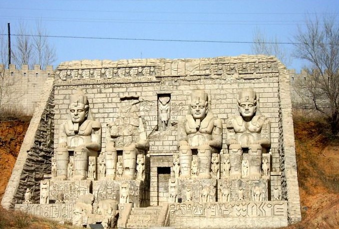 在埃及尼羅河西岸的峭壁上,雕鑿著四尊巨大的坐像,這四尊坐像均是古埃及第19王朝法老拉美西斯二世的雕像,每尊坐像高20米,其中一尊在戰爭中遭到破壞。門口上端雕刻的立像是太陽神,這是炫耀法老巨大權力的紀念性雕刻,臉部屬于肖像雕刻,具有寫實的特點。在尼羅河上航行可以看到這些巨人,并給人留下法老具有強大威力的難忘印象。坐像下面那些較小的雕像是法老的皇族。它建于公元前1275年。