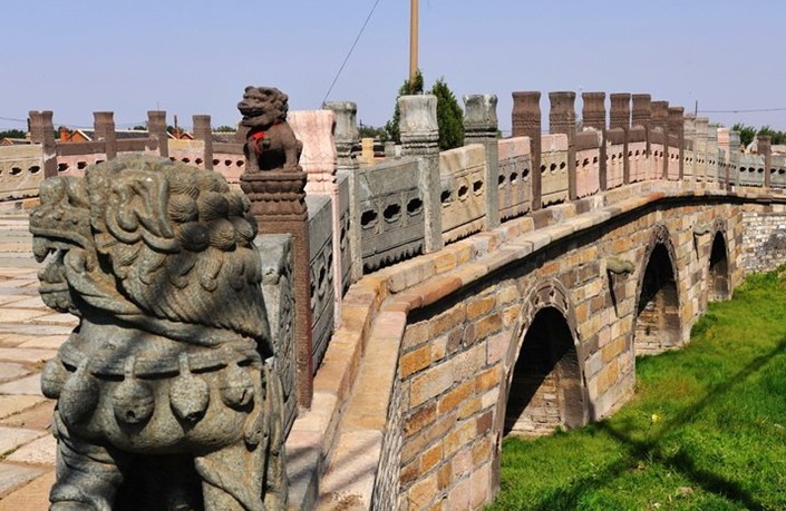 永安橋為三孔石拱橋,全長37米,外寬14.5米,路面寬8.9米 ,橋頭寬12米。橋身兩側分別立著十九根石欄桿,橋端的石柱上是圓雕的獅子,其它為荷葉狀柱頭。橋頭兩側各有一對雕刻精美雌雄相望的大石獅。橋的欄板上裝飾著柿蒂花紋和卷云紋,端柱外的抱鼓石上刻有鹿、虎、麒麟、犀牛、羊、蝶等圖案。版權所有山東聊城聊之旅國際旅行社有限公司,轉載必究!橋身的北側有二龍探首,橋身南側則露出一對龍尾,從遠看,呈二龍馱橋之勢,造型生動,別具匠心。