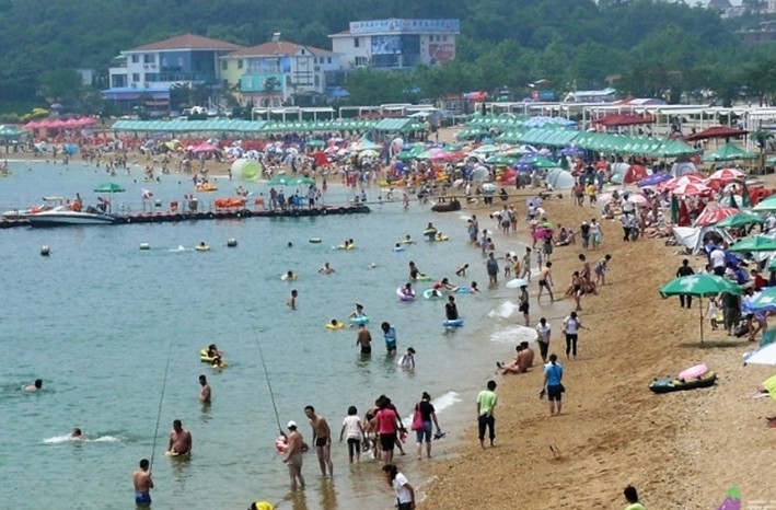 碧波泛彩疑無涯, 華傘半遮嬉水丫。老虎灘上赤足爽, 傅家莊外卵石滑。