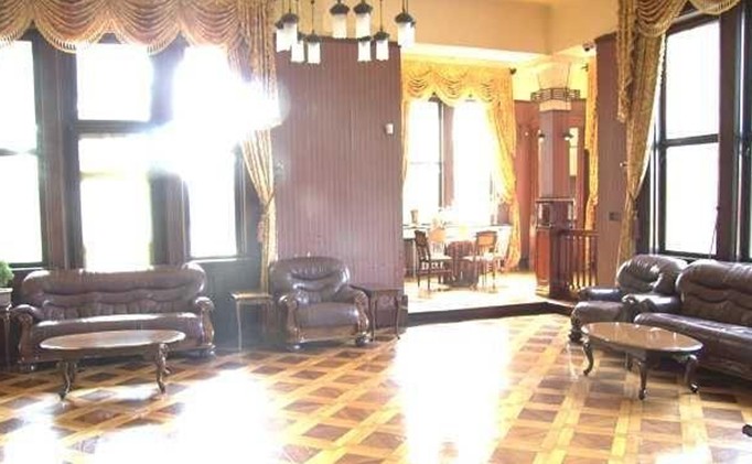由西門進入既為第二層,習慣稱為一樓,內設過門廳、中廳、大廳、會議室、舞廳、餐廳和花房等組成,大廳高為9米,頂部懸以華麗的吊燈。大廳的墻壁上裝飾銅雕藝術品和油畫,墻下部圍以棕色的護板;一側墻角處是一個嵌著綠色玉石的壁爐,另一角擺放著一架古老的德國三角架鋼琴,大廳墻壁上掛有一只鐘表是德國著名鐘表設計家瓊漢斯設計的,它有一個特點是一小時報四次時,每一刻響音樂,整點是敲鐘點。整個大廳充滿了古樸濃郁的西方情調。