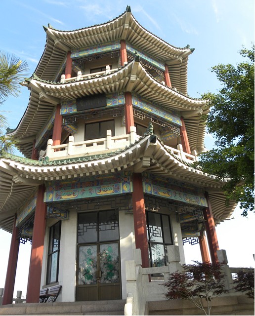 我們從小魚山的大門抬階而上,看到的這個亭子是一個挑檐式的六角亭,在亭內可以把碧波蕩漾的匯泉灣一覽無余,故得名“碧波亭”。“碧波亭”的匾額“碧波”二字是由著名的國畫藝術大師吳作人手書的。大家看遠處的山上有三棟紅色蘑菇樓宛如三柄熊熊燃燒的火炬,那是青島市十大山頭公園之一的信號山公園。在半山腰綠樹叢中的那棟別具特色的建筑是青島市迎賓館,原是“德國總督府官邸”。我們再由“碧波亭”拾階而上,站護欄邊可以看到右下邊有兩幢民族式建筑,一座形如城樓,一座貌似宮殿,那就是青島市海產博物館。