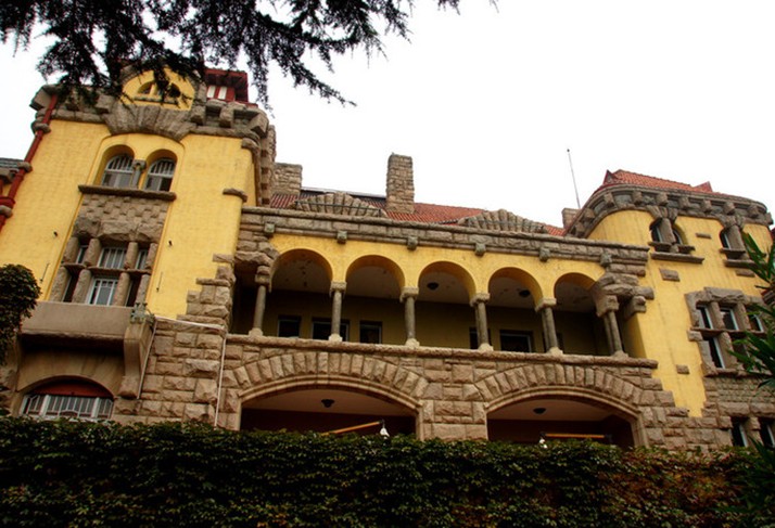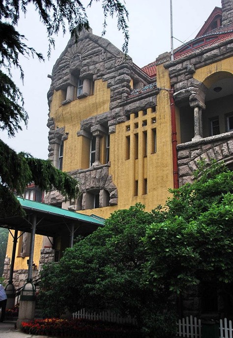 青島總督府,氣勢宏偉,建筑面積為4083平方米,高度為30米,厚達60多厘米的外墻以黃色為基調,局部以花崗巖石料作裝飾,石面加工粗樸,正門墻飾以淡綠色、淡灰色花崗巖石,頂部石料雕以美麗的圖案,于粗放之中見精巧。米紅色筒瓦、藍色魚鱗瓦、綠色牛舌瓦鋪設的樓頂,使大樓更加精美別致。1957年環繞迎賓館修建了圍墻形成了占地面積達86000多平方米的庭院,院內遍植果樹和多種觀賞植物。