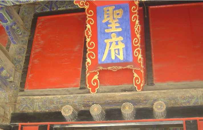 圣府大門就是曲阜孔府的大門,圣府為三間五檁懸山式建筑,匾書“圣府”二字,是明朝嚴嵩所書。門兩邊有對聯一幅“與國咸休安富尊榮公府第,同天井老文章道德圣人家”,其中“富”字少上面一點,寓“富貴無頭”,“章”字一豎通到上面立字,寓“文章通天”,此聯概括出千百年來“圣人家”。