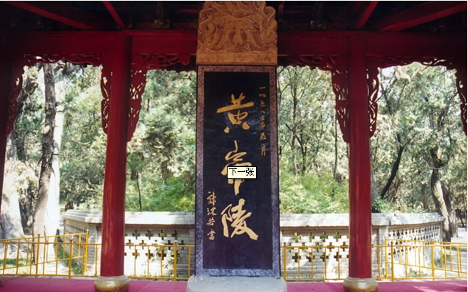 再北為誠心亭。面闊五間。進深一間。祭祀官員至此須整飾衣冠,靜心凈面,方可進入大殿祭祀。再北為碑亭,面闊五間,進深一間,卷棚頂。亭內立有毛澤東手跡“祭黃帝陵文”和蔣中正手跡“黃帝陵”碑石。