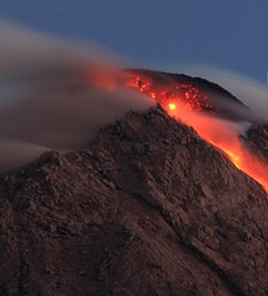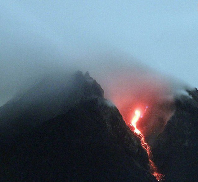默拉皮火山位于印度尼西亞爪哇島的中部。在日惹東北32公里,海拔2911米,默拉皮意為“不滅之火”,是一個錐形火山,也是印度尼西亞活動性最強的火山,1006年首次爆發(fā),山頂粉碎,毀滅了中爪島的一個王國。埋沒世界七大奇觀之一的婆羅浮屠佛塔。1548年以來又噴發(fā)68次,平均兩三年噴發(fā)一次,每次都有傷亡。火山距離日惹市相當近,山麓居住著幾千人,有的村莊在海拔1700米的高處,當?shù)鼐用褡裥幸环N古老的儀式,每年都在火山口旁邊牲口供祭,以期安撫默拉皮山的神靈,但死亡依然頻頻降臨。由于其威脅人類居住地的安全,被國際地球化學和火山學協(xié)會列為應當加強監(jiān)督與研究的全球16座火山之一。
