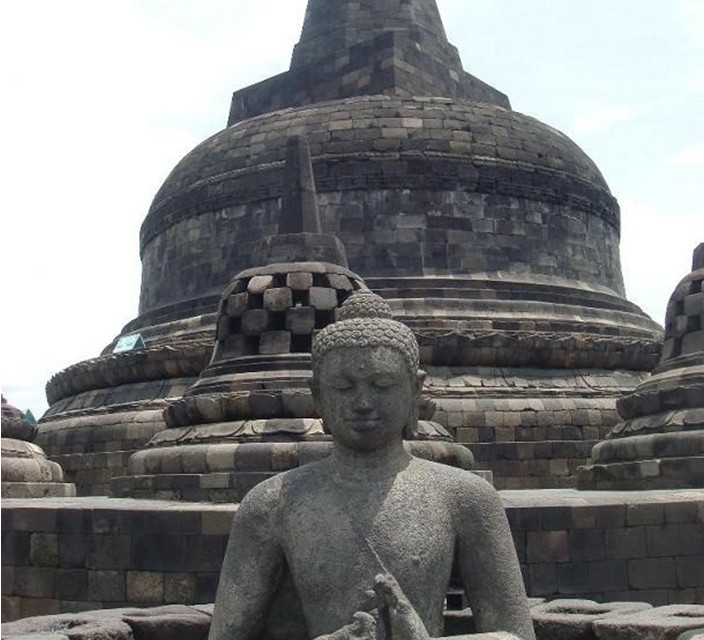 婆羅浮屠位于印度尼西亞,大約于公元750年至850年間,由當時統治爪哇島的夏連特拉王朝統治者興建。“婆羅浮屠”這個名字的意思很可能來自梵語"Vihara Buddha Ur",意思就是“山頂的佛寺”。后來因為火山爆發,使這佛塔群下沉、并隱蓋于茂密的熱帶叢林中近千年,直到19世紀初才被清理出來。與中國的長城、印度的泰姬陵、柬埔寨的吳哥窟并稱為古代東方四大奇跡。