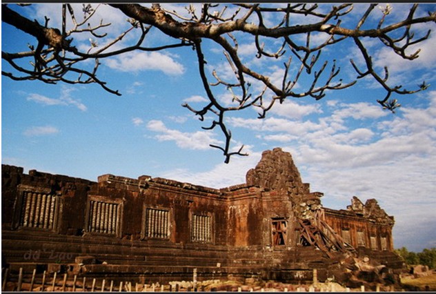 底部由位于一座巨大的方形水池邊緣的兩座宮殿建筑廢墟組成好,水池由一條用于洗禮儀式的雨道一分為二。上部是寺廟的大殿,里面曾經供奉過一座巨大的濕婆生殖器。不過后來,這座神廟被改成了佛教寺廟,但是原先的印度教雕刻還保留在了門檻上就在。濕婆生殖器大殿的北邊,有一座大象石和一座神秘的鱷魚石。通往圣殿的神龍(naga)臺階兩側是成排的紫薇花(dokjampa)樹。在上層的平臺上面可以俯瞰道腳下壯觀的湄公河河谷。