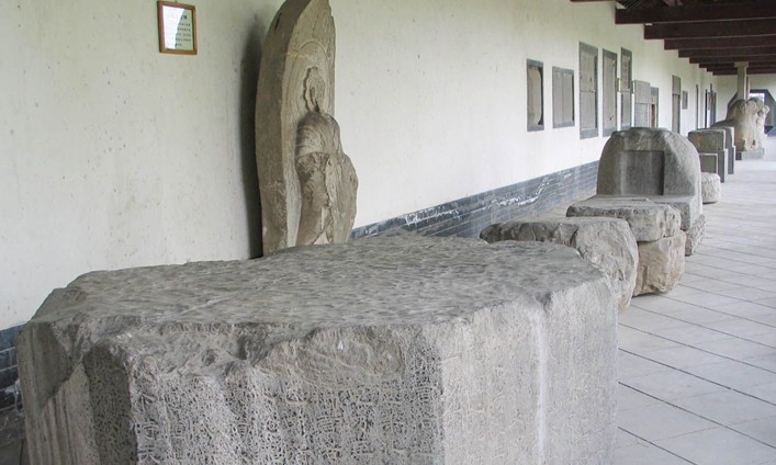 北魏阿彌陀佛說法石造像,高5.85米,現藏青島市博物館,俗稱丈八佛。庭院內露天陳列許多珍貴文物,其中院東側護欄內,坐東面西、南北向并列4尊雕刻精美的北朝石刻造像和兩座石碑。中間兩尊石像高達一丈八尺,故稱“丈八佛”。佛像身軀微傾,雙目細長,彎如新月,目光下視,面含微笑,兩腳跌立于刻有蓮花的石座上,顯示了距今1400多年前北朝時代宗教藝術的偉大成就。