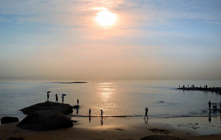 3、老爺頂觀日出 :為阿掖山主峰,其石“巍峨峭拔,紱繞如椅望”。立于其上,向東可觀日出扶桑,飄渺三島(即前三島),南視“秦山(海州灣內(nèi)——島嶼)海市”為佳景,令人嘆絕。夜眺景色更佳,北望日照港十萬噸級(jí)碼頭如龍臥波;南望嵐山港燈火輝煌,燦若繁星;遠(yuǎn)望連云港巨輪穿梭,燈火通明,一山觀三港,唯有此處。