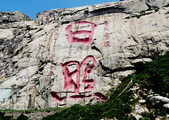 河山山勢崢嶸,氣勢雄偉,遍布古跡,處處勝景,使游人大有登泰山之感。代表日照現代形象的巨書“日照”兩字刻于河山懸壁之上。“日”字長20米,寬17.5米:“照”字長25米,寬 25.5米。它是漢字摩崖石刻的世界之最,載入世界吉尼斯大全,給河山增添了一大景觀。