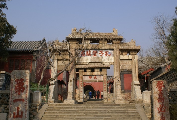 孔子登臨處位于泰山一天門北,為四柱三門式跨道石坊。古藤掩映,典雅端莊,額題“孔子登臨處”五大字。明嘉靖三十九年 (1560)始建。柱聯曰:“素王獨步傳千古,圣主遙臨慶萬年”。坊兩側分立兩碑,東為明嘉靖間濟南府同治翟濤題“登高必自”碑;西為巡撫山東監察御史李復初題“第一山”碑。北側為兩柱單門的“天階”坊。
