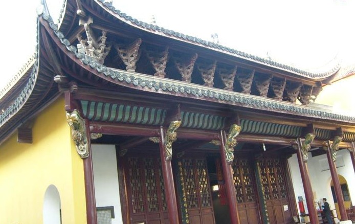 天王殿迎江寺大門上方書有“迎江寺”三字匾額,門兩邊各置鐵錨一個,重約3噸,這是該寺有別于其他寺廟的獨特之處。據民間傳說,安慶地形如船,塔為桅桿,若不以錨鎮固,安慶城將隨江東去,故而設之。寺內建筑,以四進殿堂及一塔為主體。一進天王殿,殿高10.4米,面積約300平方米。正中坐一尊袒胸露腹、張口憨笑的彌勒佛像,背后站韋馱像,面對釋迦牟尼佛。殿兩側分列“四大天王”,各高3米余,氣勢威嚴。二進大雄寶殿,高17.72米,面積409平方米。殿內三尊大佛,居中是娑婆世界的教主釋迦牟尼佛,東西兩側為消災延壽藥順佛和阿彌陀佛。殿后騎獅的為文殊菩薩,騎象的為普賢菩薩。兩廂佛臺上供降龍、伏虎等十八羅漢塑像,姿態各異,造型生動。
