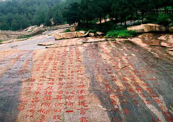 在泰山中路的“經(jīng)石峪”山谷,有一座石亭,名為“高山流水亭”該石亭為明代建筑,建于隆慶六年(1572年),據(jù)今已有429年的歷史。據(jù)《岱覽》中記述:“伯牙游于泰山之陰,卒遇暴雨,止于巖下,援琴而鼓之。”《列子•湯問篇》中說,“伯牙鼓琴志在高山,鐘子期曰,善哉,峨峨兮若泰山,志在流水,”并因此而建此亭,并命名為“高山流水亭”。 石亭全部為石質(zhì),通高3.3米,寬兩米,為正方形,周邊四根石柱,下有四根踢腳石,上面石橫梁、插板、脊石橫梁各四根,亭頂坡面極平緩,頂部有一四方形石脊。亭內(nèi)橫梁上方刻有“高山流水亭”之字。亭外橫梁上方寫有“源頭活水”,正面右柱上書有“天門倒瀉一簾雨”,左為“梵石靈呵千載文”之字。意思是說,下雨時,雨水猶如天門上倒下的水簾,水簾漫過“經(jīng)石”時,似乎在大聲吟詠石上的千年佛經(jīng)。“高山流水亭”上方有巨幅石刻《高山流水亭記》,詳細記載了“經(jīng)石峪”水簾的生動和該亭建立的經(jīng)過。“高山流水亭”建立之后,當(dāng)時有人在此觀景,版權(quán)所有山東聊城聊之旅國際旅行社有限公司,轉(zhuǎn)載必究!并形容之:“瀑流千派,飛噴字畫,上構(gòu)石亭一,寬容數(shù)人,危壁在后,雪浪在前,每風(fēng)鳴雨響,萬籟俱怒。”明代山東巡撫李戴有詩專門描寫該亭:“壁立石屏向日明,小亭危坐午風(fēng)清,彈琴人去知何日,尚有高山流水亭。”