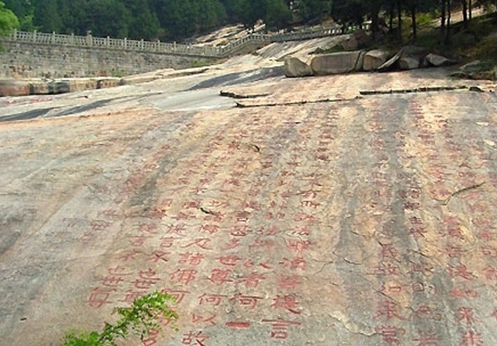 經石峪位于泰山斗母宮東北,有岔路盤道相通,過漱玉橋、高山流水亭、神聆橋即至。峪中有緩坡石坪,上刻隸書《金剛經》,俗稱曬經石,明隆慶年間萬恭書刻“曝經石”。