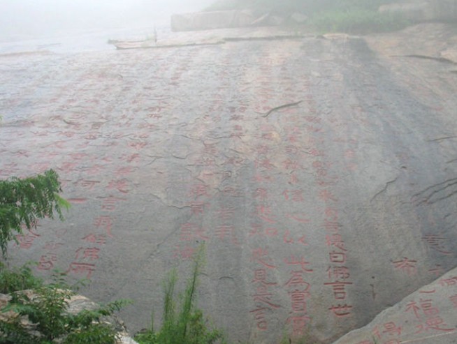 經石峪金剛經刻位于斗母宮東北經石峪,是中國現存規模最大的佛經摩崖刻石。 經文刻于面積2064平方米的緩坡石坪上,自東而西刻《金剛般若波羅密經》,采用后秦鳩摩羅什譯本,原本全1卷、32分目、5172字,經刻只刻到15分目“特經功德 兮”,計44行,每行125字或10字不等,凡2799字,字徑50厘米。經刻歷千余年風 雨剝蝕、山洪沖擊、游人踐踏、捶拓無度,已殘泐磨滅過半,現僅存經文41行、 1069(包括可認讀的殘字和雙勾字)