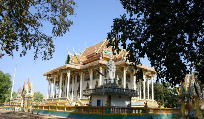 這個(gè)引人注目的石灰?guī)r山峰位于馬德望西南18公里處,在這兒很多事情都會(huì)發(fā)生——你攀登、流汗、贊嘆,很有可能還會(huì)哭泣。徒步沿著山后的路攀登時(shí),你會(huì)看到一座曾被紅色高棉用作監(jiān)獄的古廟和兩個(gè)涼氣森森的洞穴,當(dāng)年屠殺的罪證似乎化作悲鳴依然在風(fēng)中回蕩。繼續(xù)往上爬,你會(huì)看到兩門越南人在戰(zhàn)爭(zhēng)中用過的大炮(一門俄國造,一門德國造)。最后,在山頂回頭望去,山下的鄉(xiāng)村風(fēng)景和那座有著金色佛塔的小廟,會(huì)讓你贊嘆不已。目前在PhnomSampeau山的底部,正在雕刻一尊38米高、112.5米長的佛畫。當(dāng)?shù)氐男『⒆邮呛軆?yōu)秀的向?qū)В瑑r(jià)格為每小時(shí)1000r。