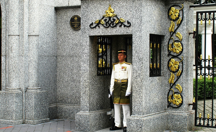 簡單的皇宮門口是由一扇并不是很寬敞的鐵門與旁邊的小崗亭與小門洞組成。僅僅就這一小片風景,就讓游客迷戀不已。鐵門是用黑色作底色,襯以金黃色作為裝飾,典雅大方,從嚴肅中透出一種高貴。在鐵門的側邊的崗樓和崗樓旁的門洞中,各有一名哨兵站崗,在崗樓中的哨兵身穿白色上衣配有綠色前裙的制服,手持長槍;在門洞中的哨兵,則穿一件紅色上衣,黑色長褲,胯下騎一匹黑色高馬,威風凜凜,常常吸引無數鏡頭。另外,不時在門口還會站有一排杠槍哨兵供人們拍照留念,閃閃的長槍在陽光的照射下與遠處阿拉伯風格的皇宮金頂遙相呼應,分外亮麗。
