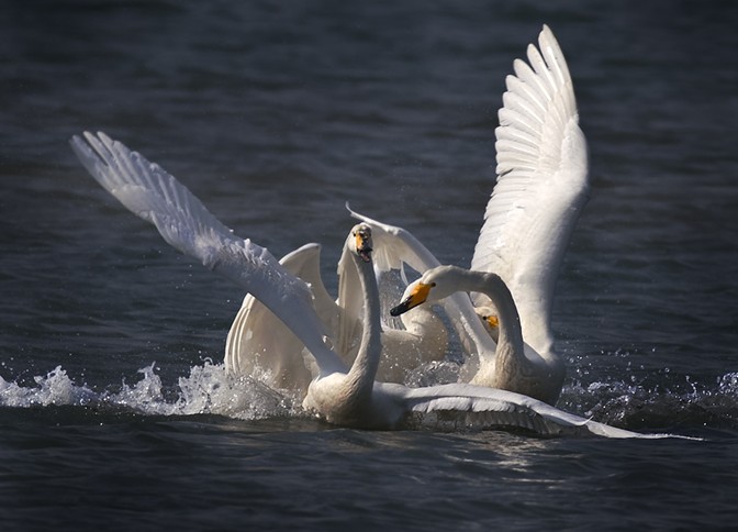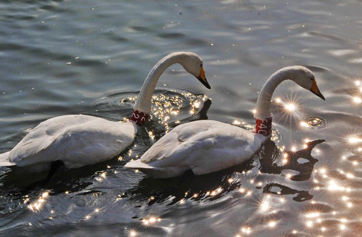 每當(dāng)村民或游客走進(jìn)海灣投放食物時(shí),大天鵝就不約而同地向岸邊涌來(lái),金色的玉米粒撒向藍(lán)色的水面和潔凈的沙灘,溫文爾雅的大天鵝也都爭(zhēng)相游到村民、游客周圍,毫不防范地?fù)屖虫覒?稍遠(yuǎn)處的還貼著水面低飛而來(lái)。版權(quán)所有山東聊城聊之旅國(guó)際旅行社有限公司,轉(zhuǎn)載必究!初見(jiàn)人與天鵝如此近距離地接觸,有人還以為這是一群人工豢養(yǎng)的天鵝呢,可天鵝脖子上的紅色“環(huán)志”分明在告訴他們,這可都是不遠(yuǎn)萬(wàn)里飛來(lái)的野生大天鵝啊。