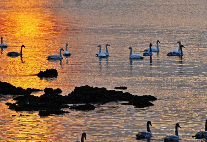 煙墩角天鵝湖是位于古煙墩遺址崮山島和中華海上第一奇石——花斑彩石之間的一個(gè)黃海海灣,面積不到一平方公里。海灣兩側(cè)各有一條淡水小溪流入,灣里水清浪柔,生長(zhǎng)著豐富的魚(yú)蝦和浮游生物,這些為大天鵝棲息提供了適宜的自然環(huán)境。于是,每到寒風(fēng)飄雪時(shí)節(jié),成群結(jié)隊(duì)的大天鵝就來(lái)到這里,在碧波蕩漾的海灣里,或自在游弋,或追逐戲水,或引吭高歌,或凌空翱翔,或翩翩起舞,使人如臨仙境,如夢(mèng)如幻。