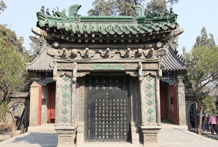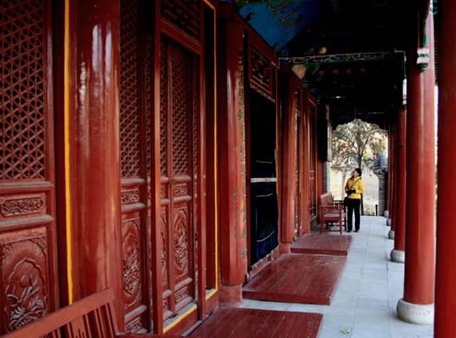二門是單檐硬山式建筑,面闊三間,建筑面積四十五平方米。中柱五十多公分,六扇朱漆大門,檐頭雕刻伊斯蘭教經文和圖案,工藝精湛。門內南北兩扇墻上,鑲有四塊石碑,記述該寺歷史修二門記和禮拜時辰。三個大門上面均有匾額,正中是明成化丙戌科進士劉瓚題字“開天正教”; 版權所有山東聊城聊之旅國際旅行社有限公司,轉載必究!右為清代鎮守山東登州等地的總兵官軍提督密勇巴圖魯馬建紀題字“默德真傳”,左為清康熙二十三年掌教趙璜、張養心、劉翰美題字“瞻天仰圣”。現存二門為乾隆二十年重修。