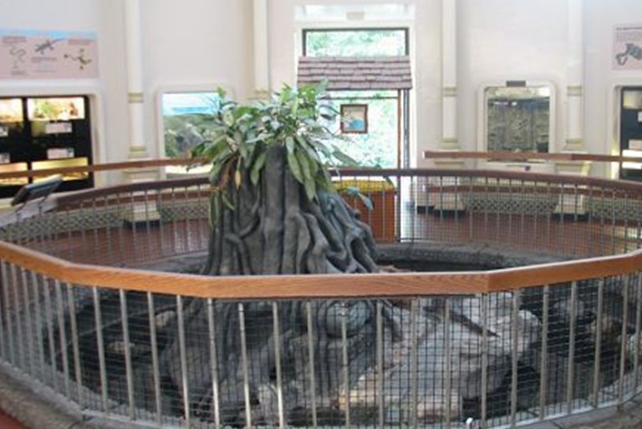 爬蟲(chóng)園采納的是開(kāi)放設(shè)計(jì)概念,飼養(yǎng)的園地都布置成為原始叢林沼澤河床,讓爬蟲(chóng)有如回返自然生態(tài)環(huán)境,自由爬行或游水。而在不同角落或展覽館里,有15英尺長(zhǎng)的大鱷魚(yú)、四腳蛇(大蜥蜴)、四方外觀的烏龜、超過(guò)百歲的老巨龜、有毒的眼鏡蛇、巨蟒、細(xì)如線般的青蛇、多色彩的壁虎、白里透紅的小青蛙等,此外,也有一個(gè)可讓游人與蜥蜴近距離對(duì)看或撫摸的開(kāi)放式蜥蜴園。