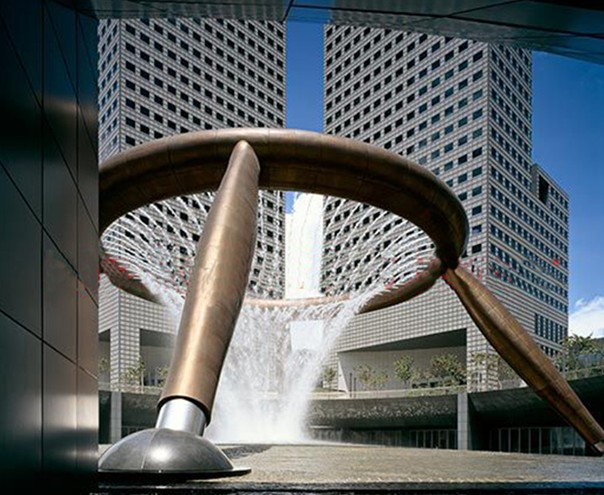 財富噴泉是由四根傾斜的青銅巨柱組成,柱頂是一個直徑66米的青銅圓環,整個結構垂直高度13.8米。整個噴泉占地1683.07平方米,噴出的水柱可達30米。