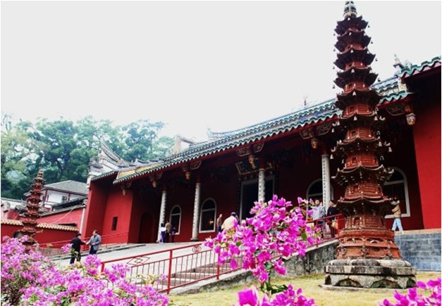 涌泉寺山門保留著唐朝建筑風(fēng)格,為一有框無門的空門,石門柱上鐫刻著一副短聯(lián):“凈地何須掃,空門不用關(guān)”。此聯(lián)構(gòu)思奇巧,意寓在涌泉寺山門東邊,有一石砌拱門,上書“靈源深處”。傍崖而下石階60余級(jí),中裂一澗,寬約3米,深約10米,似石洞,故名“靈源洞”。版權(quán)所有山東聊城聊之旅國際旅行社有限公司,轉(zhuǎn)載必究!因?yàn)椤昂人畮r”石刻,這一帶又統(tǒng)稱“喝水巖”。靈源洞兩側(cè),薈萃了自宋以來摩崖石刻200多段,約占鼓山現(xiàn)存摩崖題刻的一半,行、草、隸、篆諸體俱備,猶如一座天然石刻書法寶庫,譽(yù)為“東南碑林”。題刻中有宋刻近百段,元刻12段,明刻30余段,清朝至今百余段,其中尤以宋代名書法家蔡襄的“忘歸石”,施元長的“喝水巖”以及理學(xué)家朱熹,民族英雄李綱和當(dāng)代郭沫若等題詠石刻最為著名