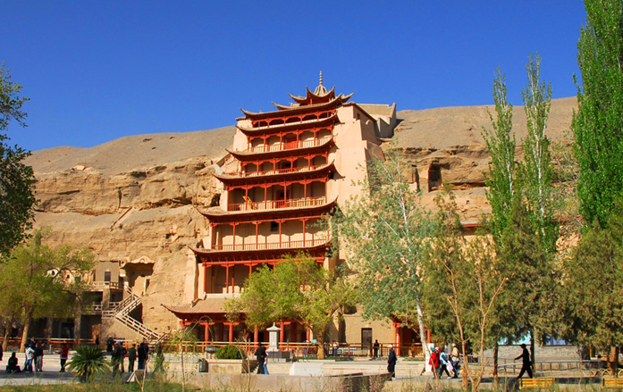 莫高窟地處絲綢之路的一個戰略要點。它不僅是東西方貿易的中轉站,同時也是宗教、文化和知識的交匯處。莫高窟的492個小石窟和洞穴廟宇,以其雕像和壁畫聞名于世,展示了延續千年的佛教藝術。
