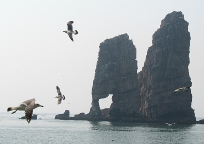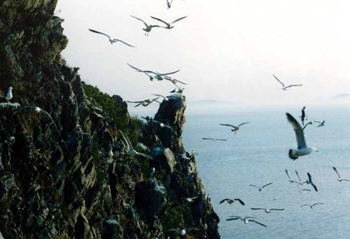 萬(wàn)鳥(niǎo)島坐落于長(zhǎng)島諸島中部偏東,這個(gè)海拔73.5米、僅有0.05平方公里的小島,在浩渺的汪洋大海之中,簡(jiǎn)直是一粒微不足道的沙粒,然而海深魅力大,島小情趣多,因島上棲居著幾萬(wàn)只黑尾鷗、海鸕鶿、白腰雨燕等海鳥(niǎo),后稱(chēng)萬(wàn)鳥(niǎo)島。海岸地貌懸崖陡壁占90%以上,斷崖系石英巖與板巖互層,節(jié)理發(fā)育,破碎性強(qiáng),經(jīng)千百年風(fēng)化和海蝕,崖壁此凸彼凹,石階、石臺(tái)、石窟、石穴鱗次櫛比,形成一座自然的“海鷗石樓”。每年四、五月間,成千上萬(wàn)只海鷗在此安家,覓食、嬉戲、休憩、生兒育女。這時(shí)的小島變成了喧囂的鳥(niǎo)國(guó)、沸騰的劇場(chǎng)、海鷗的天堂。