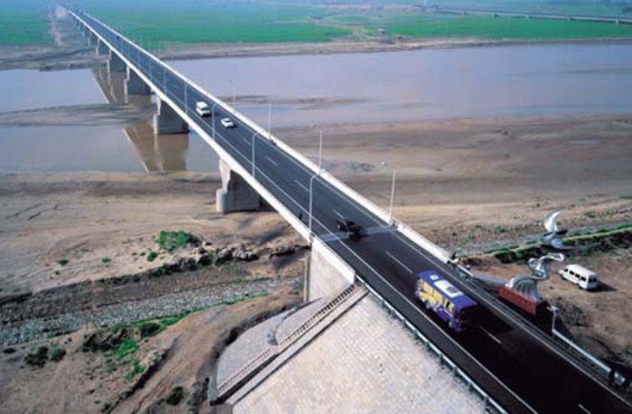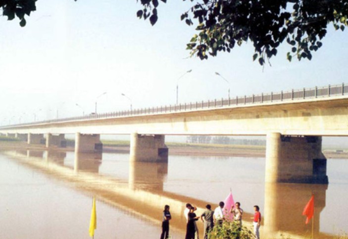 位于市南郊,它是從包頭市白云鄂博到陜西等省通衢的重要組成部分。大橋全長810米,主孔12孔,每孔跨徑為65米,橋面寬12米,下部由14墩臺組成,上部構造為預應力鋼筋混凝土箱式連續(xù)梁,采用最新工藝多點頂推法施工。上部結構為3聯(lián)4孔65米預應力鋼筋混凝土連續(xù)箱梁,跨徑組合為3*(4*65)+20米,1983年建成通車,是黃河中上游最大的橋梁之一。設計荷載汽車—20級;拖車—100級。