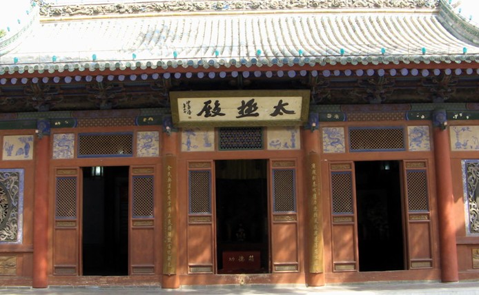 伏羲塑像就供奉在這神龕內。這尊塑像體形魁梧、氣宇軒昂、濃眉大眼、肌膚豐腆,微笑的面龐體現了他智慧卓然、心地善良的內在氣質。塑像袒胸露肩赤裸雙腳,其粗獷樸實、平易、耿直的風度,給人以"既相托,敢委性命"的可以信賴之感。伏羲身著樹葉,端然而坐,雙手托著刻有八卦的太極圖,目光炯炯,高瞻遠矚,給人以勝利在望、未來無限光明的視覺印象,難怪天水當地群眾是那樣的喜愛、敬仰伏羲廟里的伏羲塑像呢。這座先天殿的屋架結構技巧,也是值得一提的。這是在中國采用早期"減柱法"建造大屋的成功一例。屋架結構嚴謹,梁柱少而粗大,屋頂四周均用抹角梁拉牽。上層在二金柱間施七架椽,版權所有山東聊城聊之旅國際旅行社有限公司,轉載必究!上置蜀柱、駝峰、抄手,再施五架梁和平梁,平梁之上又有雞爪柱、抄手、駝峰等與之相互制約。這樣一來,既省料,又結實,還使大殿內部顯得空曠、開闊。這都是聰明的設計師和技藝高超的工匠師傅,在實踐中繼承和發展了中國古代建筑藝術的精髓的優秀成果,是很值得驕傲的一件事。幾百年來,天水地區屢次發生七級以上地震,而這座大殿始終安然無恙,這難道是偶然的么?此外,伏羲廟內還有來鶴亭、鼓樂亭、太極殿等建筑, 似乎從建筑技術和美學觀點來分析考究,都各有各的說道, 這里就不再一一贅述了。