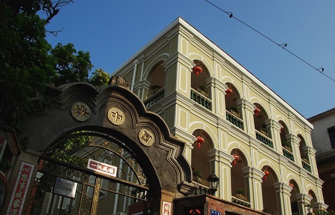 中樓是一幢仿古大屋頂宮殿式建筑,采用重檐歇山頂,四角高高翹起,門、窗、廊、廳的楣上均掛水泥透雕掛落飛罩,檐角均飾纏枝花卉或吸水蛟龍挑梁雀替均塑龍鳳飾件。特別是屋頂下裝飾二個藻井,井壁上繪中國花鳥畫,外形又頗像亭子,非常突出。走廊外沿裝飾斗拱掛落,花籃垂柱,把中樓裝點得十分民族化。遠遠望去,這幢建筑頗有氣勢,又穩重脫俗。