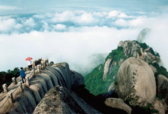 登上天池峰頂,可以領略一下“會當凌絕頂,一覽眾山小”的氣概。這里視野寬闊無比,景色十分壯麗。是觀日出、云海、佛光、晚霞的最佳方位。天晴之時,極目遠眺,飛來峰、銜珠峰,五指峰,山連天際;煉丹湖如同一面銀光閃閃的鏡子被潛河、皖水兩條銀鏈夾在中間;大龍窩、后山、東關諸峰如同一個個土丘,盡收眼底。