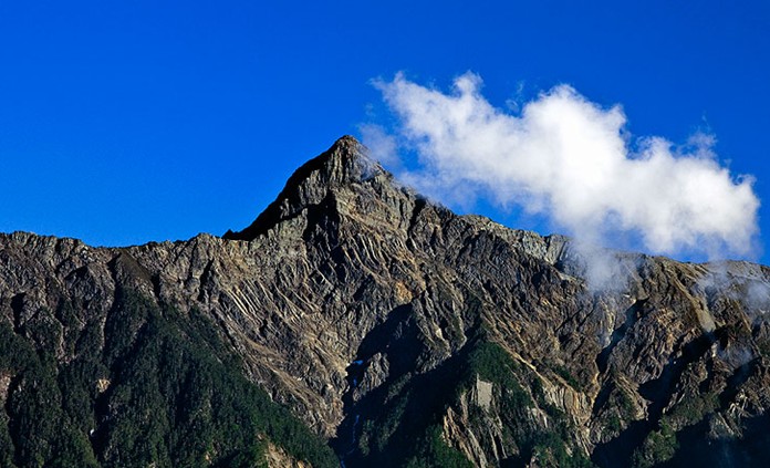 經(jīng)科學(xué)家們考察認(rèn)定,玉山是水成巖山脈,地貌奇特,地層褶曲,使峰頂形似波濤,加上風(fēng)雨侵蝕,砂巖、頁巖崎嶇急斜,容貌與一般山景迥然不同。突兀崢嶸,高插云天,四季積雪不化,成為四季常綠的臺灣島上的奇異景觀。