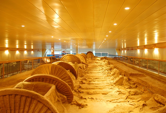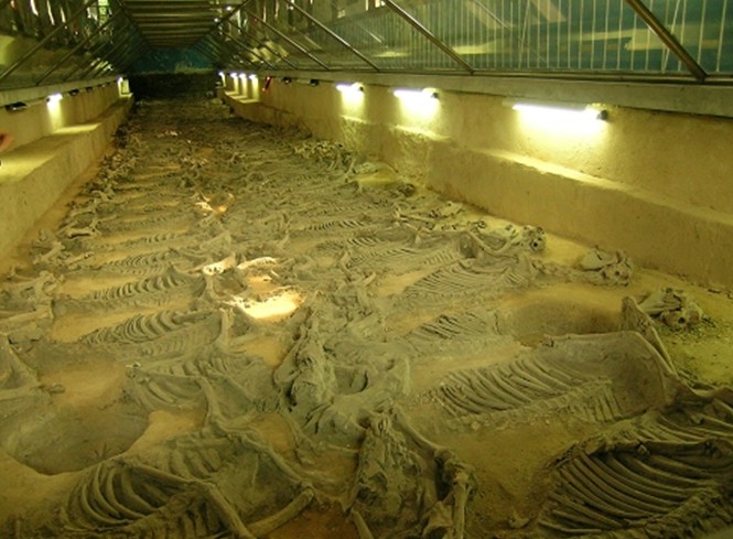 殉馬坑成“∏”形圍繞在該墓的東、西、北三面。東西各長70米,北面長75米,寬5米。東面早年被毀,1964年發掘了北面54米,發現殉馬145匹。1972年又發掘清理了西面南端30米,發現殉馬83匹。據此排列密度推算,全部殉馬當在600匹以上。馬分兩行,馬頭向外,昂首側臥作奔走狀,版權所有山東聊城聊之旅國際旅行社有限公司,轉載必究!在最前面的五匹,頸系有銅鈴。殉馬排列井然有序,個個呈臨戰威姿。經鑒定,殉馬全系壯年馬,是被處死后,人工排列而成。