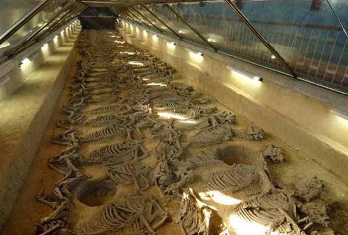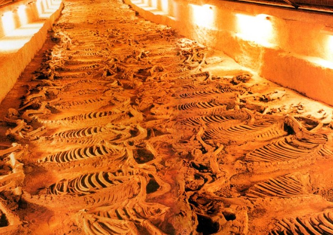據(jù)專家考證,殉馬多數(shù)是 6--7 歲口的壯年馬,是人為處死后,按照一定的葬式排列而成,馬分兩行,排列整齊,昂首側(cè)臥,四足蜷曲,呈臨戰(zhàn)姿態(tài),好像只要聽到戰(zhàn)鼓擂動還會四蹄騰空。