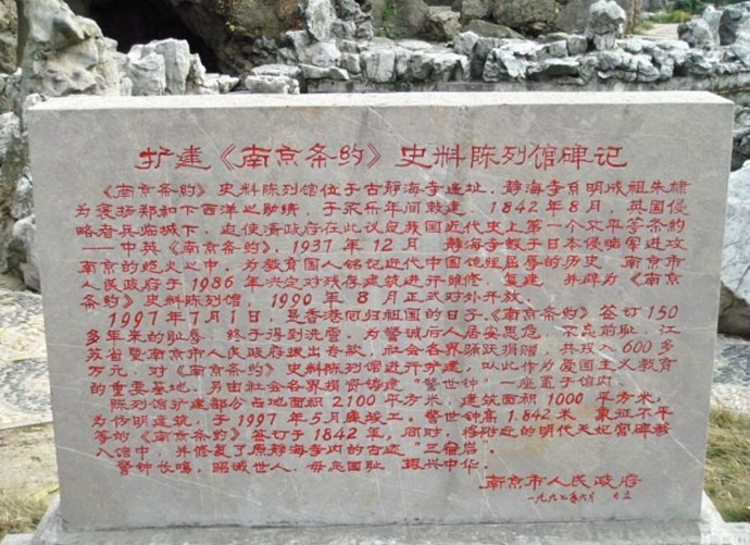 《南京條約》史料陳列館,位于南京市獅子山西麓的古靜海寺遺址上,該館通過4個展廳共130余幅(件)圖片、史料和實物,向人們展示了英帝國主義侵略中國,腐敗的清政府屈膝求和、割地賠款這一中國近代史上屈辱的一幕。館內新增的條約陳列室,陳列著我國近代(至1949年)與外國政府簽訂的1100多個條約,其中大部分是不平等條約。教育人民勿忘國恥,振興中華。
