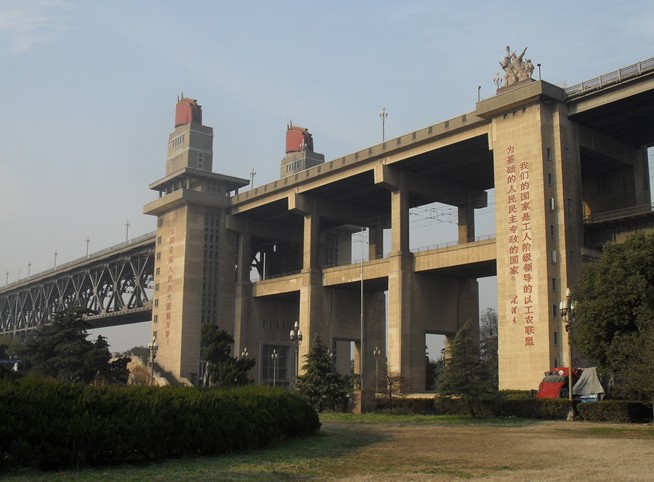 橋的南北各有一對橋頭堡,高為70米,橋頭堡上各有三面紅旗,象征著50年代的人民公社、大躍進(jìn)和總路線。橋頭堡前還各有一座高10余米的工農(nóng)兵等五人雕塑,為當(dāng)時(shí)中國社會(huì)的5大組成部分,即工、農(nóng)、兵、學(xué)、商,具有典型的文革文藝風(fēng)格。在橋頭堡堡身周圍刻有“全世界人民大團(tuán)結(jié)萬歲”等浮雕。版權(quán)所有山東聊城聊之旅國際旅行社有限公司,轉(zhuǎn)載必究!三面紅旗的橋頭堡在建成后,風(fēng)靡全國,被多次模仿,而且在60-80年代成為南京的城市標(biāo)志之一,一直到今天南京長江代大橋橋頭堡仍然是著名旅游景點(diǎn)。