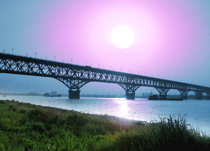 南京長江大橋,位于南京市西北面長江上,連通市區(qū)與浦口區(qū),是長江上第一座由我國自行設(shè)計(jì)建造的雙層式鐵路、公路兩用橋梁。上層的公路橋長4589米,車行道寬15米,可容4輛大型汽車并行,兩側(cè)還各有2米多寬的人行道;下層的鐵路橋長6772米,寬14米,鋪有雙軌,兩列火車可同時(shí)對開。其中江面上的正橋長1577米,其余為引橋,是我國橋梁之最。正橋的路欄上,公路引橋采用富有中國特色的雙孔雙曲拱橋形式。公路正橋兩邊的欄桿上嵌著200幅鑄鐵浮雕,人行道旁還有150對白玉蘭花形的路燈。