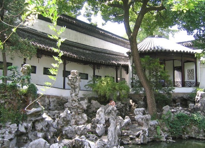 園內水體聚中有分。聚合型的主體水池中心有亭佇立,曲橋連亭,似分似合,水中紅鱗躍波,翠柳拂水,云影浮動,真是“半畝方塘一鏡開,天光云影共徘徊”。水源的處理更是別具一格,在園西假山深處,山石做懸崖狀。一股清泉經湖石三疊,奔瀉而下,如琴鳴山谷、清脆悅耳,形成了蘇州古典園林引人注目的人造瀑布。園中水景豐富,溪澗泉流,迂回于洞壑峰巒之間,隱約于林木之中,藏尾于山石洞穴,變幻幽深,曲折豐富。