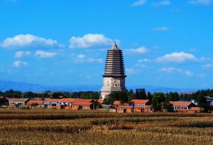 這座八角十三級密檐式磚塔,高80.22米,塔基底徑48.6米,塔體直徑34米,在現存遼塔中雄居魁首。據元一統志載可能建于遼重熙四年(公元1036年)。塔身赤面有兩行蒙文,內容是:“大清咸豐甲寅年敬修”,為清代補修所寫。