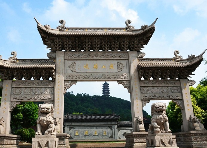 從長(zhǎng)江邊上與焦山對(duì)峙的象山腳下的渡口擺渡過(guò)江,不到五分鐘就可踏上綠色的小島—焦山。迎面的焦山大門,朱漆彩畫,一對(duì)石獅鎮(zhèn)守大門。門旁左右懸掛著清代光緒年間巴州廖倫所寫的一幅楹聯(lián)“長(zhǎng)江此天塹,中國(guó)有圣人”,顯得古樸典雅。進(jìn)入山門,迎壁就是對(duì)聯(lián)的橫披“海不揚(yáng)波”四個(gè)大字,為明代書法家胡纘宗所書,意為焦山矗立江心,猶如鎮(zhèn)海之石,驅(qū)逐水妖,故而海不揚(yáng)波。在佛教上“海不揚(yáng)波”是清平世界的意思。