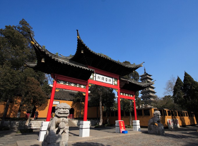 沿著數百級舒緩石階登上大明寺前的廣場,迎面是一座莊嚴典雅的牌樓。牌樓為紀念棲靈塔和棲靈寺而建,四柱三楹,下砌石礎,仰如華蓋。中門之上面南有篆書“棲靈遺址”四字,為清光緒年間鹽運使姚煜手書,字體雄美。