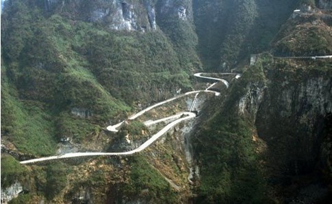 張家界天門山盤山公路有"通天大道"之稱,盤山公路全長10.77公里,海拔從200米急劇提升到1300米,大道兩側絕壁千仞,空谷幽深,共計99個彎,180度急彎此消彼長,似玉帶環繞,彎彎緊連,層層迭起,被譽為“天下第一公路奇觀”。